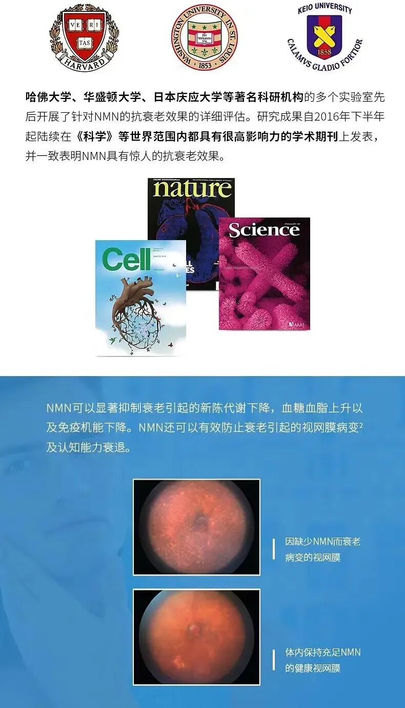 在2016-2018年间由哈佛大学、华盛顿大学、日本应庆大学等世界顶尖科研机构,分别从提升体能、抑制衰老引起的认知能力下降、逆转血管死亡、保护心脑血管功能等多角度全方位证实其抑制衰老,延长寿命的显著效果。相关研究成果发表在《Science》(科学)、《nature》(自然)、《Cell》(细胞)等权威学术刊物上。