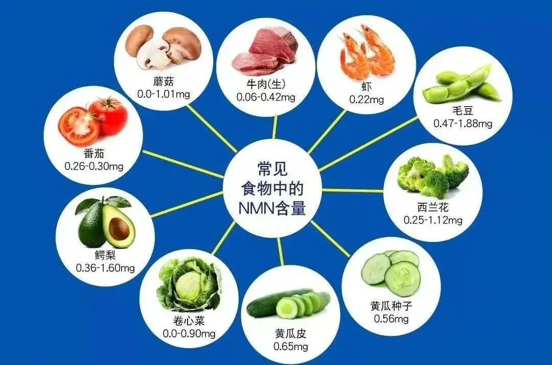 NMN(烟酰胺单核苷酸)作为NAD+的前体,是目前补充NAD+ 的理想方式。NMN存在于多种天然食物中,许多天然食物中都含有NMN,但因为含量太低,难以依靠天然食物来补充足量的NMN,想摄入100mg NMN,你需要吃约8.9kg西兰花/11kg卷心菜/23.8kg牛肉/45kg虾。