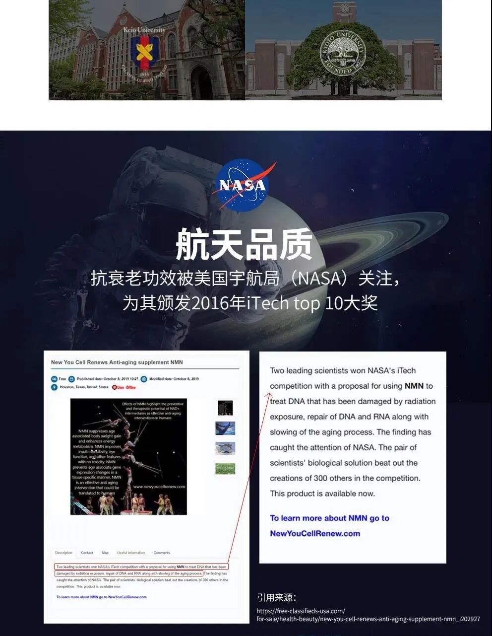 由于太空中的辐射会对宇航员造成DNA损伤,2017年,基于NMN的功效,NASA(美国国家航空航天局)开始研究将其用于保护宇航员免受宇宙射线的伤害。