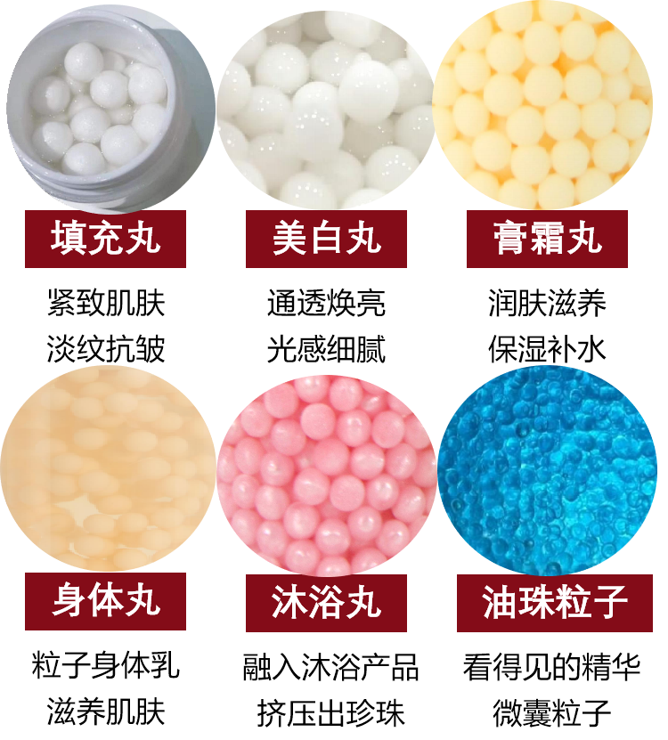 涵盖护肤、洗护等品类,不同功能、功效、颜色,满足客户与消费者的不同需求填充丸、美白丸、膏霜丸、身体丸等等